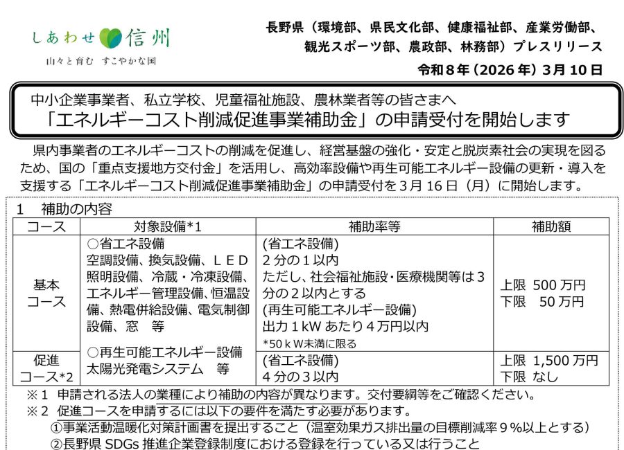 県内事業者のエネルギーコストの削減を促進し、経営基盤の強化・安定と脱炭素社会の実現を図るため、国の「重点支援地方交付金」を活用し、高効率設備や再生可能エネルギー設備の更新・導入を支援する「エネルギーコスト削減促進事業補助金」の申請受付を3月16 日(月)午前9時30分より開始します。